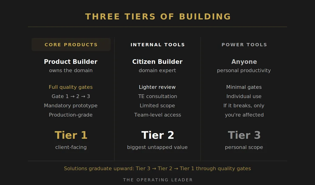 The path: Citizen Builder prototypes an internal tool. Team starts using it daily. Other teams notice. The Product Builder who owns that domain evaluates it. If it fits, the solution graduates into the core product through proper quality gates.